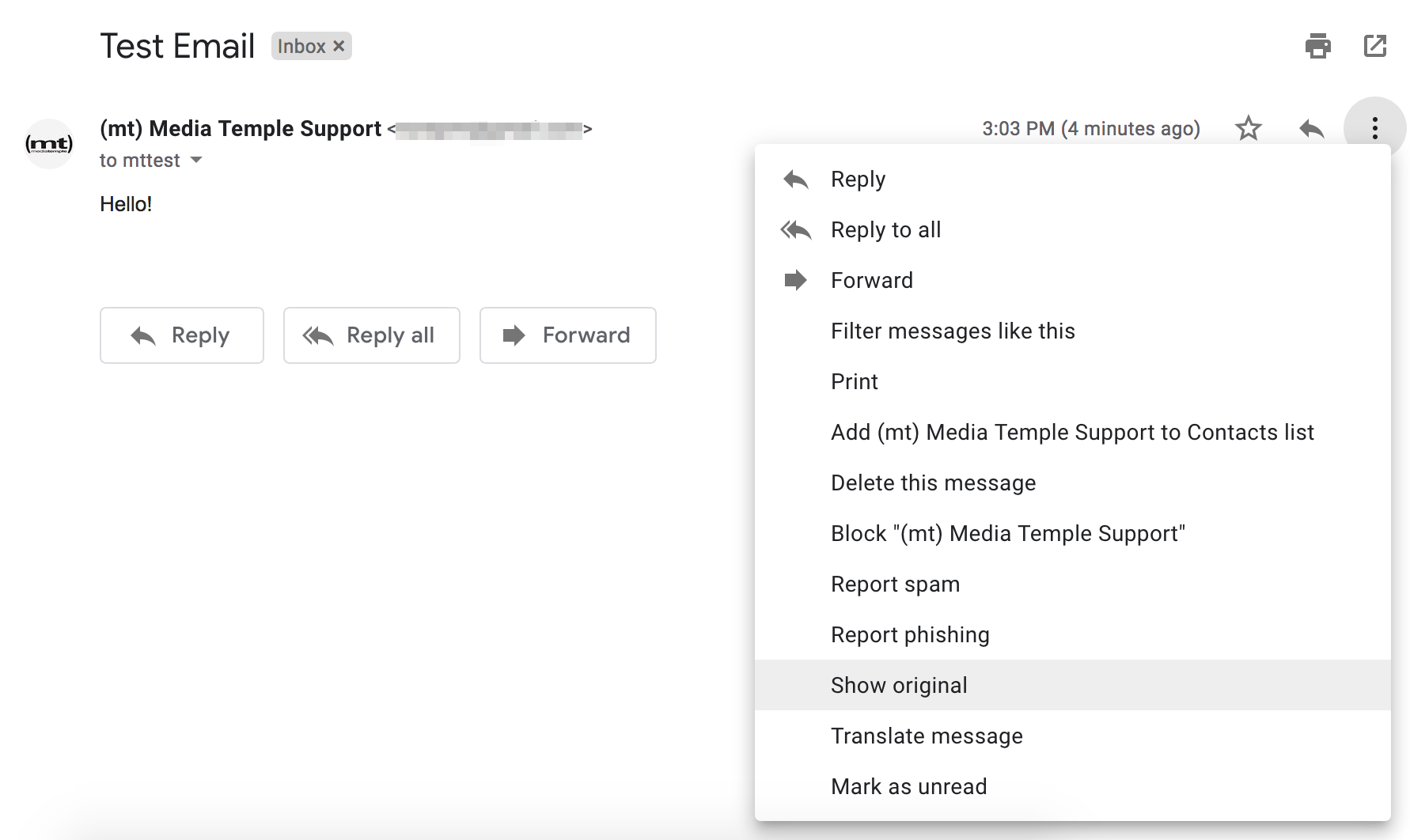 3. Choose the "Show original" option. The message will be opened in a new window.