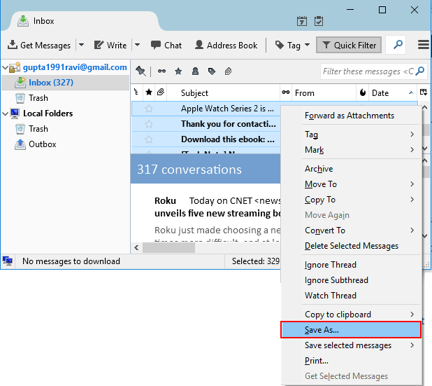 - Open Thunderbird and select the emails you wish to save. To highlight the contents of an entire folder, use the Ctrl + A combination.